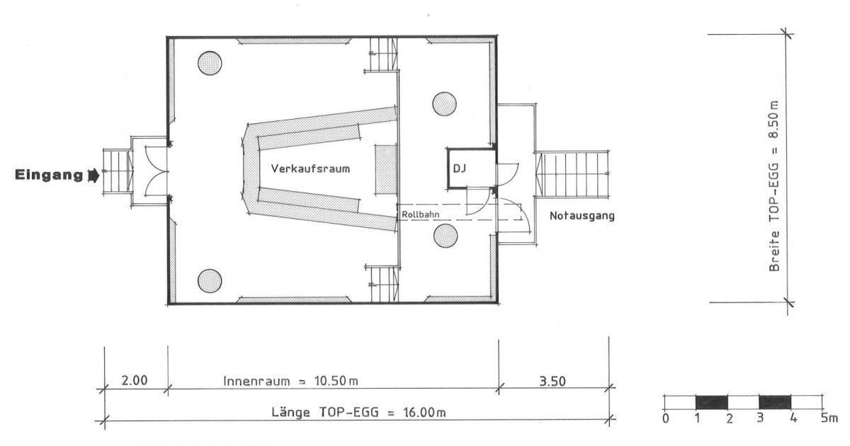 Die TOP-EGG-BAR verfügt über eine Nutzfläche von 89m2. Sie bietet Platz für ca. 250 Personen.