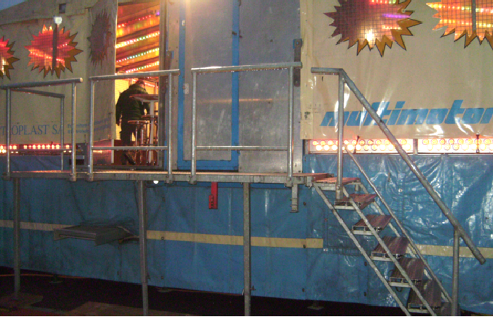 Im aufgestelltem Zustand hat die Bar eine Länge von 16m, eine Breite von 8.50m und eine Höhe von 5.50m ( inkl. Eingangstreppe und Liferantenein-ausgang ).